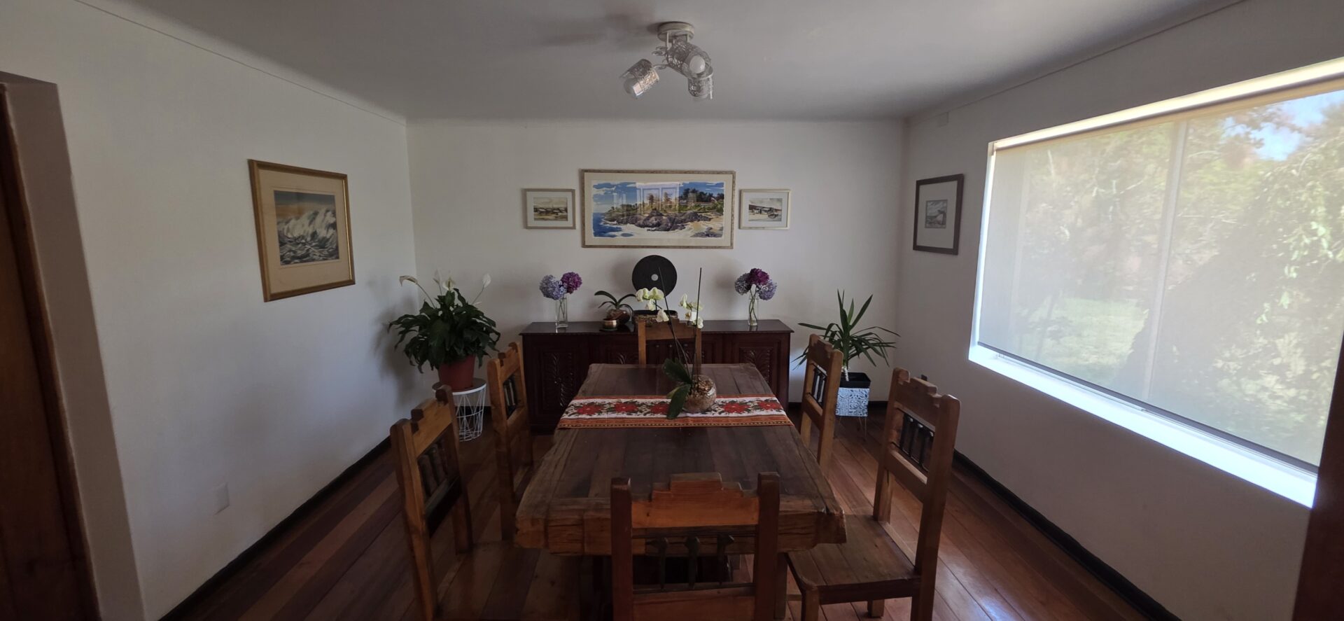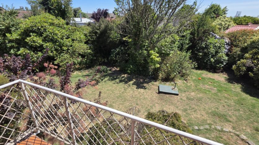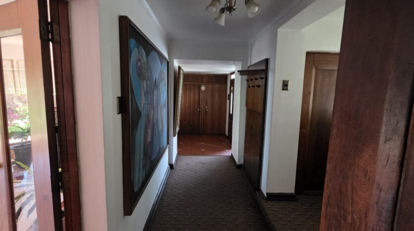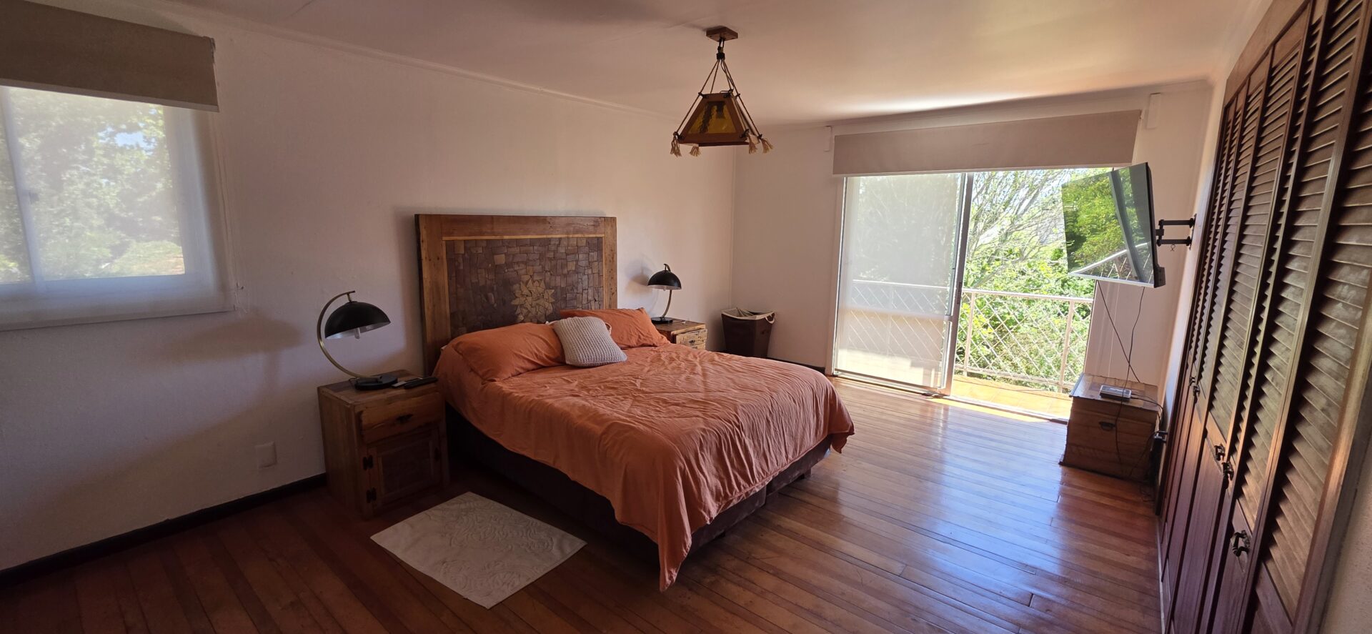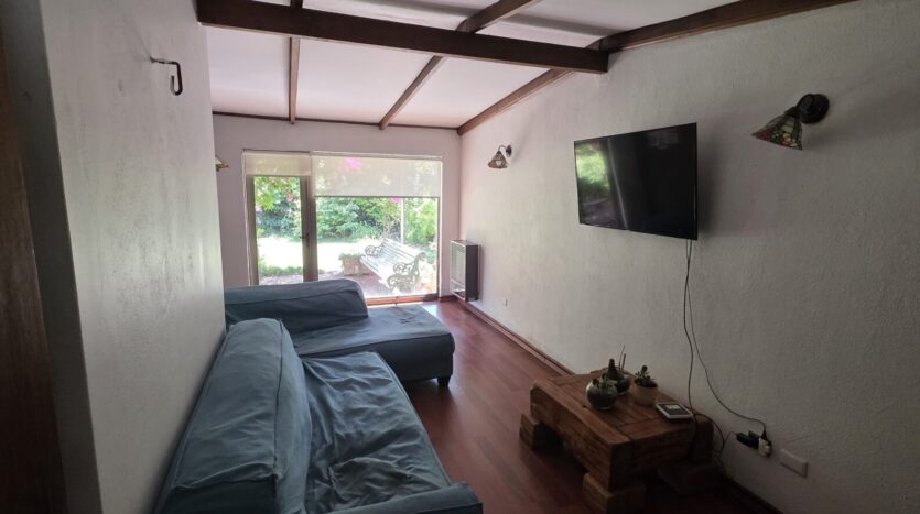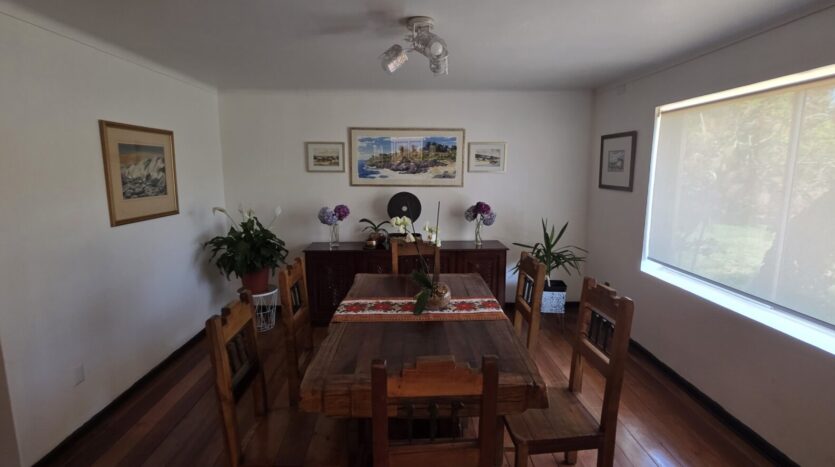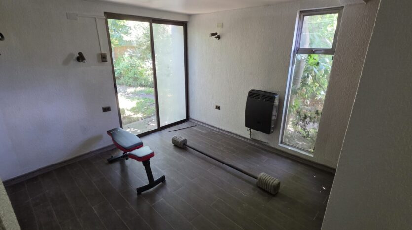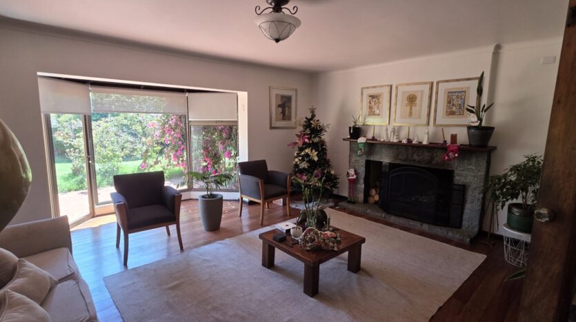 La casa cuenta con 5 dormitorios; 4 baños (dos en suite); living; comedor; cocina cerrada, amoblada y equipada; sala de estar; terraza; patio techado; dormitorio y baño de servicio; bodega exterior; lavandería exterior; leñera; antejardín; patio trasero; estacionamiento interior para un vehículo y estacionamientos para 4 vehículos más.