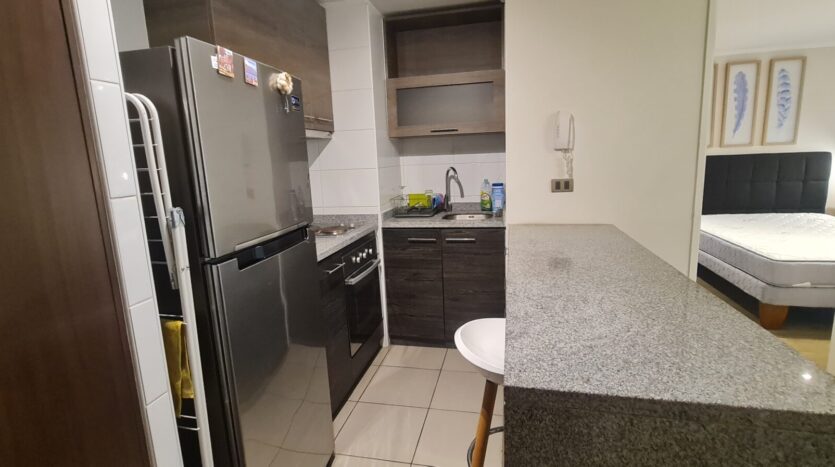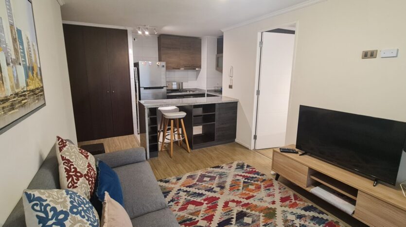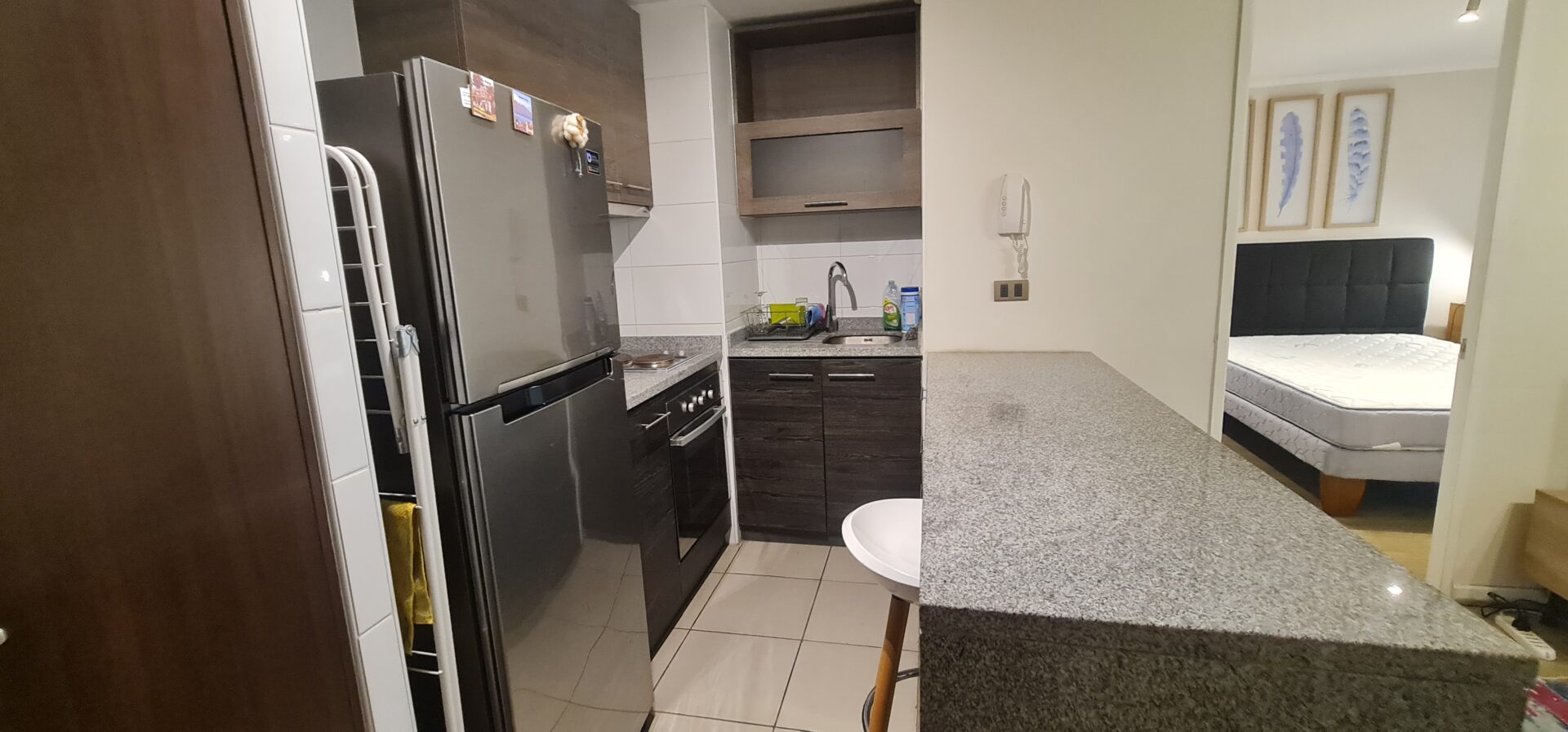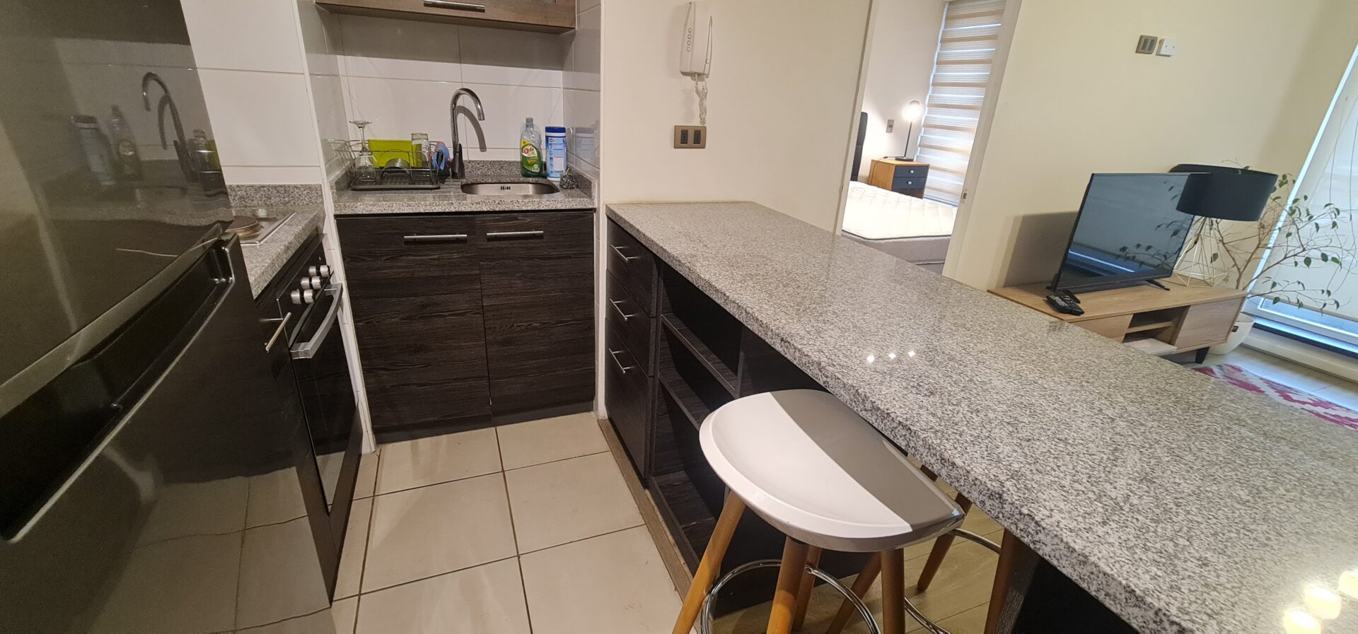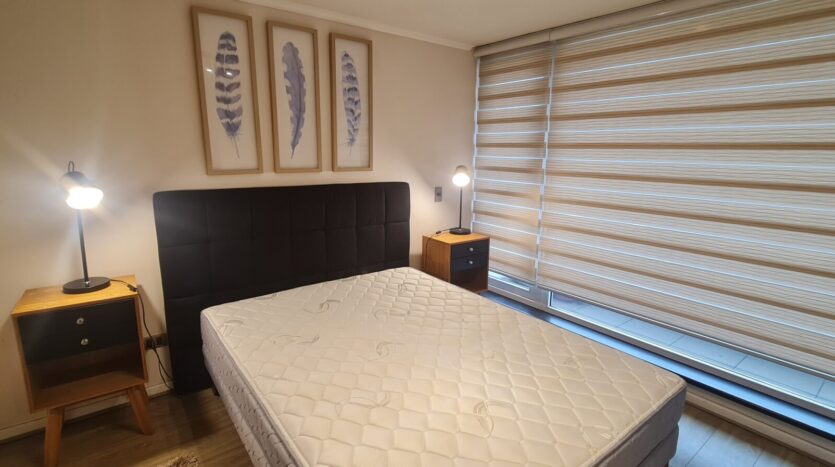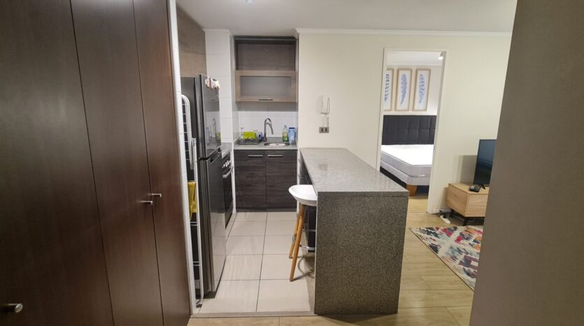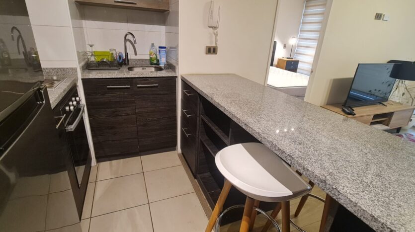 El departamento tiene 1 dormitorio con baño en suite; cocina americana (amoblada y equipada); calefacción por paneles eléctricos de bajo consumo; terraza y bodega. Otras características del departamento son: Todas sus ventanas son termopanel con perfil de PVC; cortinas roller en todas sus ventanas; piso vinílico tipo madera en living y dormitorio; porcelanato en áreas húmedas; cubierta de mármol en vanitorio; cubierta de granito en cocina; excelente vista panorámica.