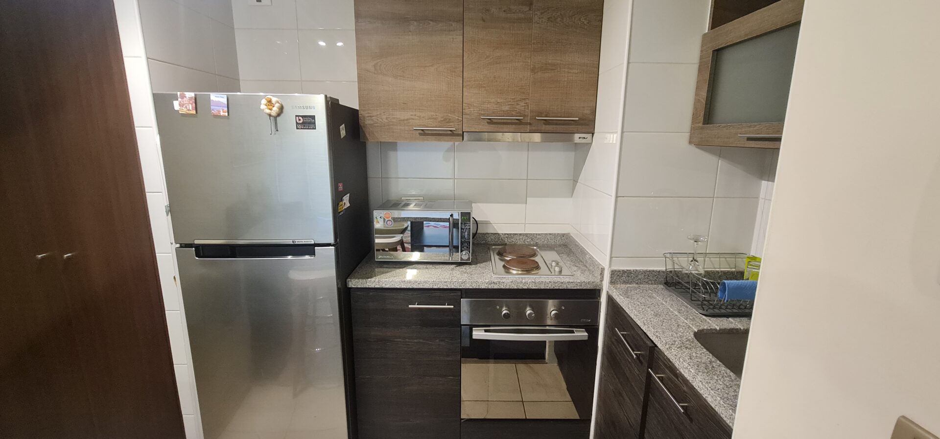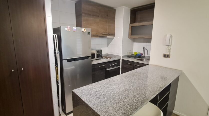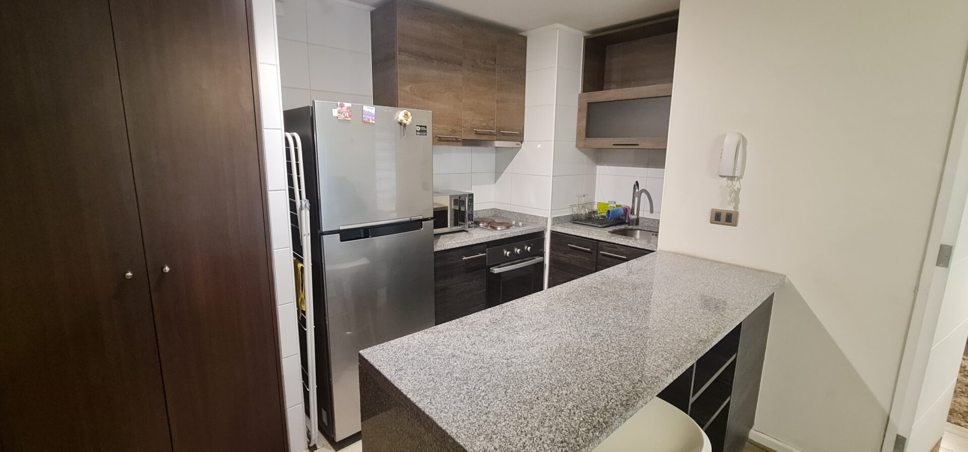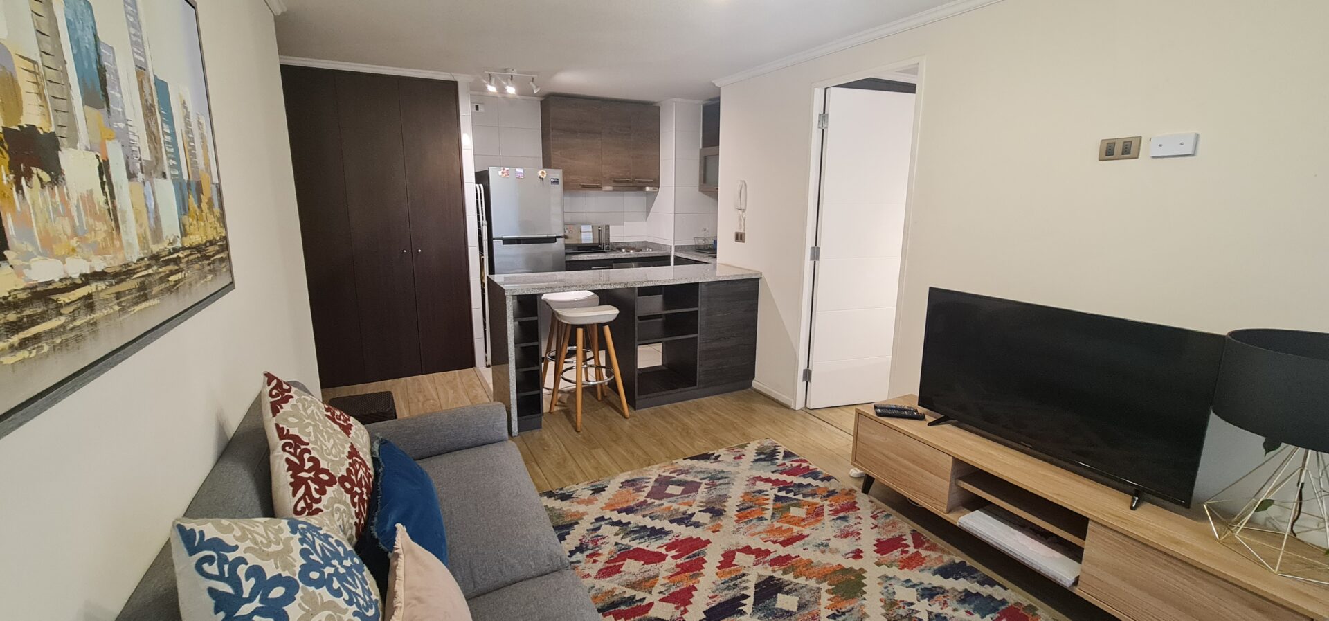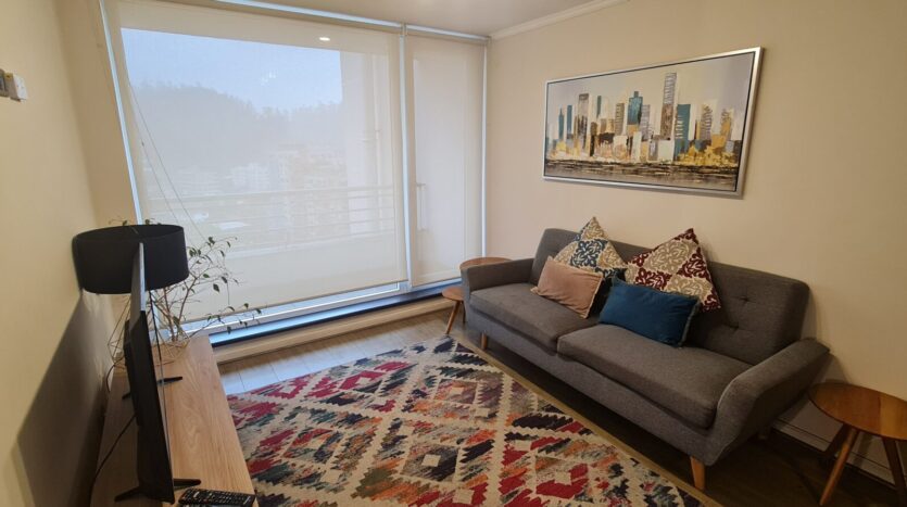 El departamento tiene 1 dormitorio con baño en suite; cocina americana (amoblada y equipada); calefacción por paneles eléctricos de bajo consumo; terraza y bodega. Otras características del departamento son: Todas sus ventanas son termopanel con perfil de PVC; cortinas roller en todas sus ventanas; piso vinílico tipo madera en living y dormitorio; porcelanato en áreas húmedas; cubierta de mármol en vanitorio; cubierta de granito en cocina; excelente vista panorámica.